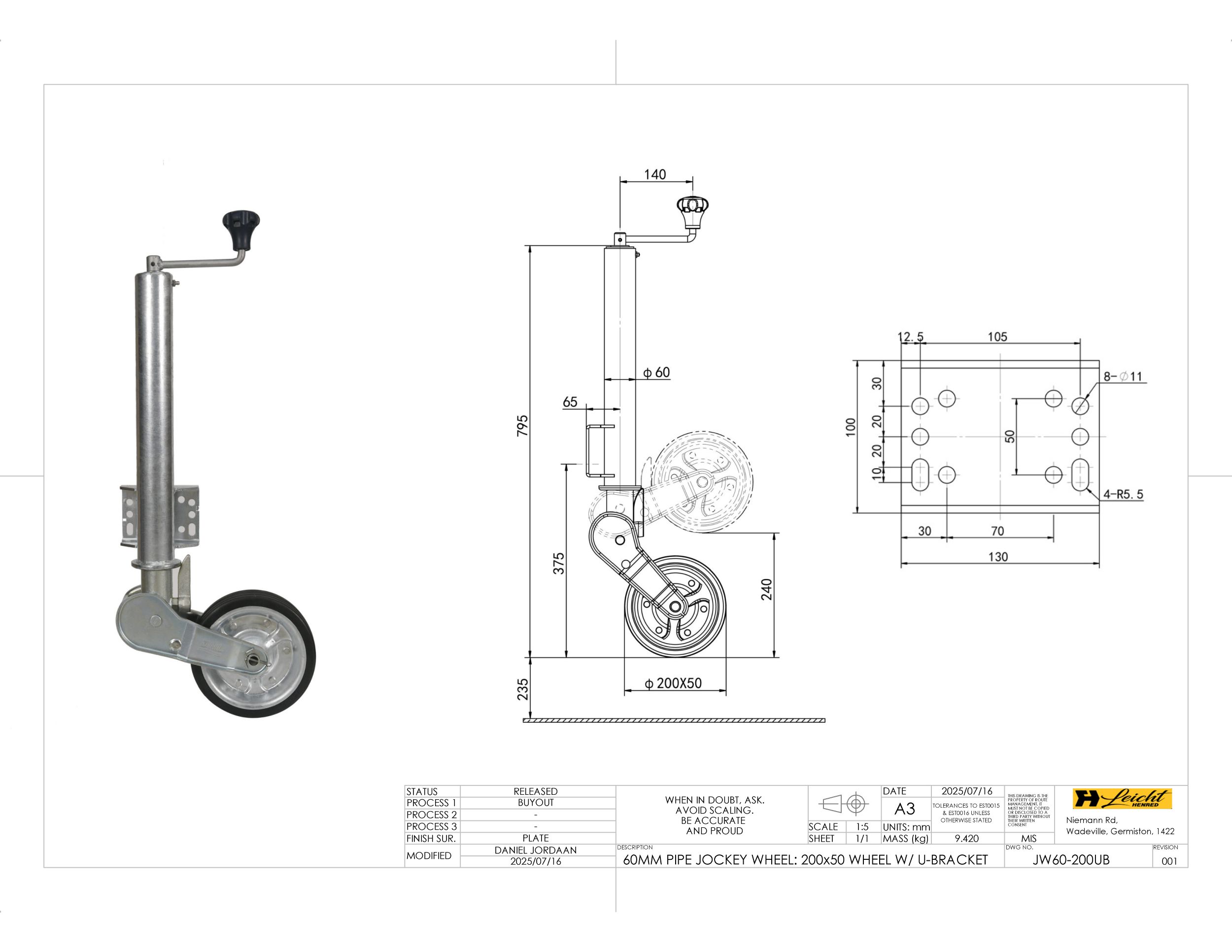 60MM PIPE SINGLE JOCKEY WHEEL: 200X50MM WHEEL WITH U-BRACKET quantity