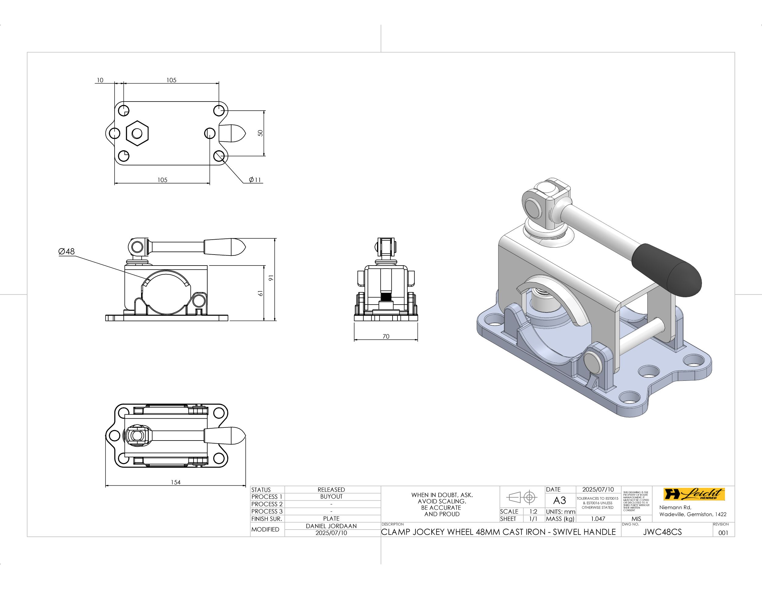 Clamp Jockey Wheel 48mm Cast Iron Swivel Handle